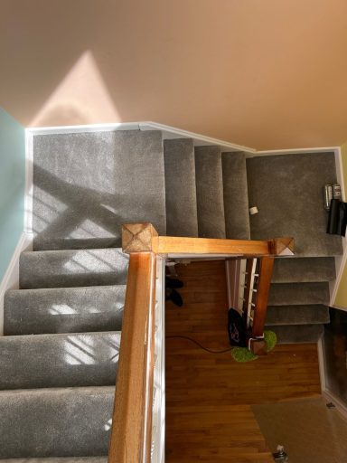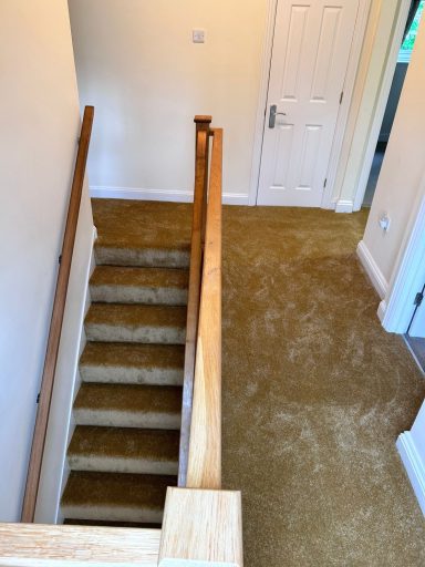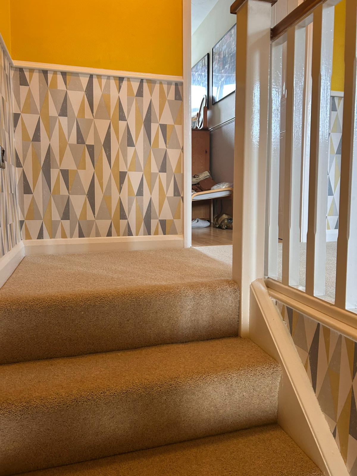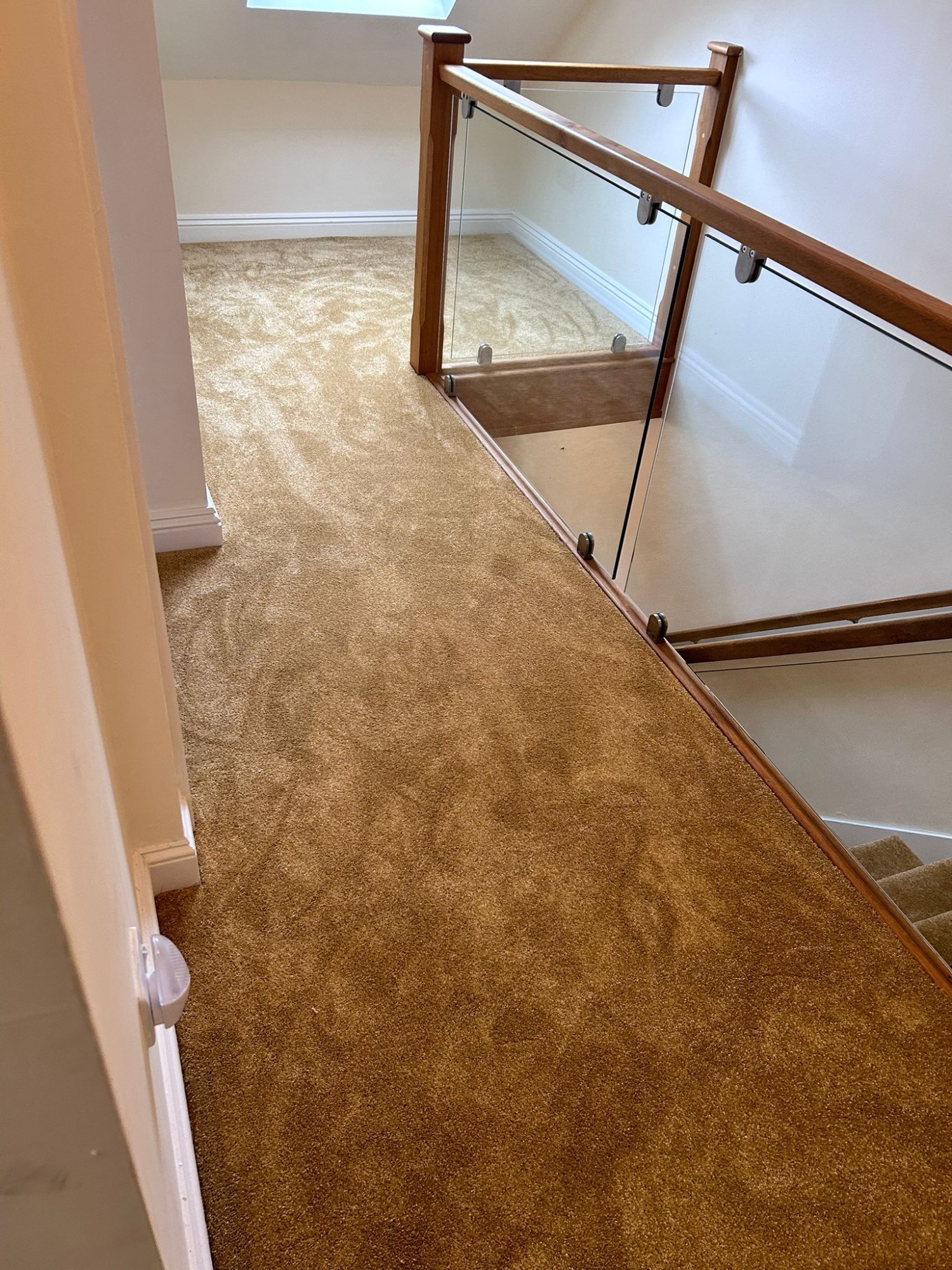 Landing and stairs carpeted in gold