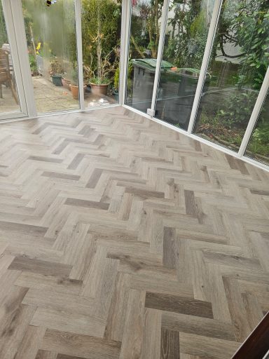 THis conservatory, lounger, dining room, kitchen, hallway and porch were all completed in Textures herringbone Ash.